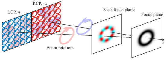 Both optical vortices have the SAM and the OAM. If n = 1, the SAM and the OAM annihilate each other, and the angular momentum of each vortex is zero. Thus, both vortices do not rotate on propagation and focusing, and the areas with a positive and with a negative SAM are not separated in space. If, however, n ≠ 1, the angular momentum of each vortex is nonzero and, therefore, both beams rotate on propagation (Figure 2, beam rotations), i.e., there is a transverse (azimuthal) energy flow in each vortex. Since the vortices are of opposite orders n and –n and their circular polarizations are also opposite, the azimuthal energy flows of both vortices are also opposite and, in the transverse plane, they interfere with each other, thus generating the areas with the opposite SAM (Figure 2, near-focus plane). In the focal plane itself, however, these transverse energy flows annihilate each other, and the SAM is zero in each point (Figure 2, focus plane).