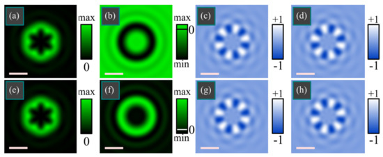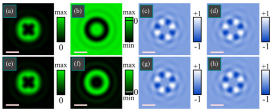 Figure 3 illustrates the distributions of intensity (Figure 3a,e), radial component of the Poynting vector (Figure 3b,f), longitudinal components of the SAM (Figure 3c,g), and OAM (Figure 3d,h) vectors of a sharply focused Gaussian beam with 3rd-order (n = 3) cylindrical polarization (1) in two transverse planes, one before the focus (Figure 3a–d) and one beyond the focus (Figure 3e–h). For computation, we used the following parameters: wavelength λ = 532 nm, focal length f = 10 μm, numerical aperture θ0 = 0.49π (NA = 0.999), calculation area is 4 × 4 μm, the longitudinal coordinate (relative to the focal plane) is z = –λ (Figure 3a–d) and z = +λ (Figure 3e–h). To describe the Gaussian shape of the input field, radial distribution of the complex amplitude was equal to A(θ) = exp[–(sin θ/sin α0)2] with α0 = π/3. Figure 4 depicts the same distributions and the same parameters as in Figure 3, but for another polarization order n = 4.