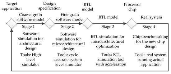 Figure 1 illustrates conventional processor design flow for architecture optimization based on simulation. It can be conceptually identified as following four stages: (1) Given the target applications or representative benchmarks, a high-level simulator is used to explore the architectural design space. It determines the potential designs space by using rough estimates of performance, power, chip area and pin count, etc. (2) Architectural simulations which define the microarchitecture or the internal organization of the processor, for example, the number of arithmetic-logical units (ALUs), the size of the caches, the number of processor pipelining stages, the structure of branch predictor, etc. (3) Register transfer level (RTL) simulations which model the processor core at a lower abstraction level. It incorporates full function as well as bit-accurate timing. For simulation acceleration, the commercial emulator and FPGA prototyping are often used. (4) If test chips are available, then chip benchmarking can be done with performance monitor unit (PMU). This evaluation results can be used to direct the next round processor design.