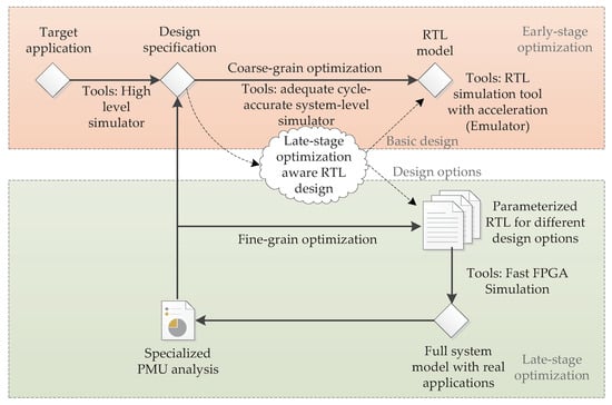 Figure 2 illustrates the FPGA-enhanced design flow for processor cores. This methodology divides the optimization tasks into two categories of optimization: coarse- and fine-grain. Coarse-grain optimization can be done at the early stage, whose simulations mainly run on an adequate cycle-accurate software simulator. Meanwhile, fine-grain optimization can be done at the late stage, whose simulations run on a fast FPGA system. It features a late-stage aware RTL design. Coarse-grain optimization is similar to the conventional optimization flow. The main difference between them lies in the output of the coarse-grain optimization step, which is aware of late-stage optimization. It is no longer merely an RTL model with a single configuration but a set of parameterized models for varying potential design options. Although late-stage optimization achieves high accuracy at the expense of flexible design options, it is adequate for constrained optimization at the late stage. The potential options can be derived from three sources: (1) Options that cannot be evaluated precisely in the coarse-grain optimization step. The simulator may not precisely realize all system features or use simplified applications for evaluation due to limitations in implementation. If a design option evaluation requires accurate simulation, then late-stage optimization is needed. (2) Options that have performance differential below a threshold. (3) Options that can be easily implemented through RTL parameterization.
