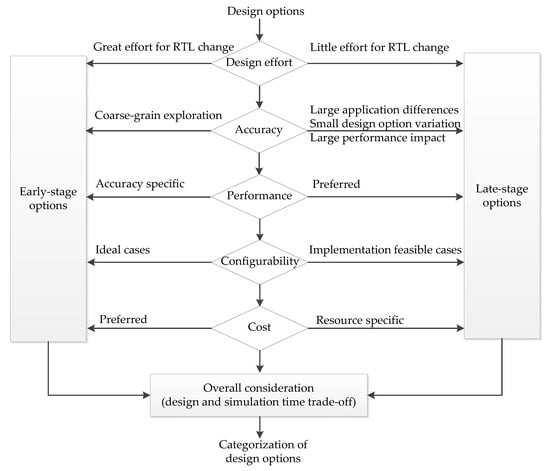 There are several general categorization rules, which will be beneficial for improving the effectiveness of microarchitecture optimization. Based on the experimental results and experiences in this study, Figure 3 presents the detailed categorization decision method of potential design options in different stages. Five factors are considered for categorization, as listed in Table 1. The potential design options go through these selection procedures to find their appropriate simulation stages.