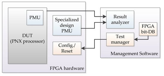 Figure 4 shows a conceptual block diagram of the FPGA system. The system comprises two parts: FPGA hardware and management software. The FPGA hardware hosts the target processor core and other components that facilitate performance analysis. The processor core has a conventional PMU that can perform general performance analysis. For information that cannot be obtained from the PMU, a specially designed PMU (SD-PMU) outside the processor core can be utilized. The SD-PMU is capable of supporting any processor hardware analysis because it can connect to any hardware signal in the processor if required. Another FPGA hardware component, the config/reset unit (CRU), is used to control the configuration of a design under test (DUT), such as frequency regulation and system reset.