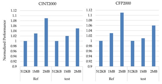 To show the effectiveness of the full benchmarking capability, we choose the test and ref input sets for the SPEC CPU2000 evaluation for comparison, where the ref input set can be viewed as the complete benchmark. In this experiment, L2 size with PAR is the target research point. Figure 7 shows the results for various L2 size configurations. The 512-KB L2 is chosen as the baseline configuration, and the geometric mean of the SPEC ratio is compared with that of CINT2000 and CFP2000. The CINT2000 and CFP2000 evaluation results from the test input set understate the performance of a large cache. For example, 2 MB under ref input set has 9.1% improvement, whereas 2 MB under the test input set exhibits only a 4.9% improvement, which is highly pessimistic. This is because the reduced test data set cannot take full advantage of the increment L2 cache size. This may mislead the design decision of the processor architect, especially on the trade-off between area and performance.