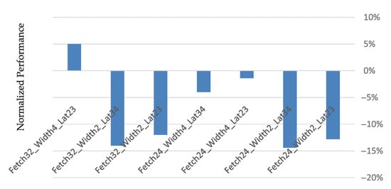 Figure 8 shows the pipeline exploration for CFP benchmarks. The basic pipeline configuration is Fetch32_Width4_Lat34, whereas other configurations are explored in this study to reduce hardware resources. For Fetch32_Width4_ Lat23, the reduction of FPlatency results in an evident performance improvement of approximately 5%. Width is an important parameter for the pipeline. Decreasing the width value from 4 to 2 greatly reduces hardware cost and degrades performance. For example, performance is lower by approximately 14% for Fetch32_Width2_Lat34. Decreasing the fetchBufferSize value from 32 to 24 also degrades performance. Their impacts differ under certain conditions, such as Width4 and Width2. The variation in performance under Width4 is more obvious than that under Width2. Such an accurate performance exploration can result in confident designs after decreasing the width while ensuring the required performance (For example, performance degradation should be no larger than 15%). Compared with the baseline configuration, Fetch24_Width2_Lat23 is a good design choice for reducing hardware cost.
