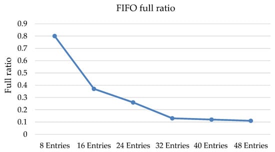 The FPGA system is sufficiently flexible for performance analysis. This flexibility profits from the reconfigurability of FPGA. The SD-PMU in the FPGA system can gain information about interested signals or components. Figure 9 illustrates the statistical results of an FIFO, with PAR options, in full state for the CINT2000 benchmarks. This FIFO is used to store the control information for the fetched instruction. This important source influences processor performance and should thus be carefully analyzed. However, the conventional PMU does not have such a type of performance counter event. To conduct this performance analysis, the full signal of this FIFO is connected to the SD-PMU and then the full state is counted each cycle. Finally, the statistical results from SD-PMU are sent to the host computer. This figure shows that when the number of FIFO entries reaches 32, the ratio of full state tends to ease. Hence, 32 entries is an ideal choice for the instruction control FIFO design. This example is relatively simple, but the principle of using SD-PMU remains the same for other complex analysis cases.
