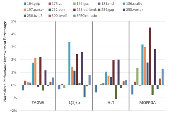 Table 5 also lists the design options for late-stage optimization. These options do not have a significant impact on hardware cost and can be easily configured by parameters. We test more than 20 design options to select the best parameter set. The CINT2000 programs are selected as the target test benchmarks for their extensive branches. Figure 10 shows the representative performance results of each program and computes the SPECint ratio for different TAGE design options. They are the best design options for each parameter and final selected design after late-stage optimization. Parameters L(1) and are related to each other and listed as L(1)/. Parameter NB is the same for the early stage and the late stage, which is not listed. Most of the best parameters differ from the chosen parameter by early-stage optimization. This variation is caused by the inaccuracy of early-stage optimization on the software simulator, which results in suboptimal options. The final performance improvement over basic early-stage optimization is approximately 1.3% on average and up to 4.5%. Moreover, the area of late-stage configuration is even smaller than that of basic early-stage configuration. This difference shows that even a small parameter change in a localized unit can cause a noticeable performance improvement. If several features of a processor core can be optimized in such manner, then performance can be improved. Additionally, performance can be further optimized by SD-PMU, which is out of the scope of this paper.