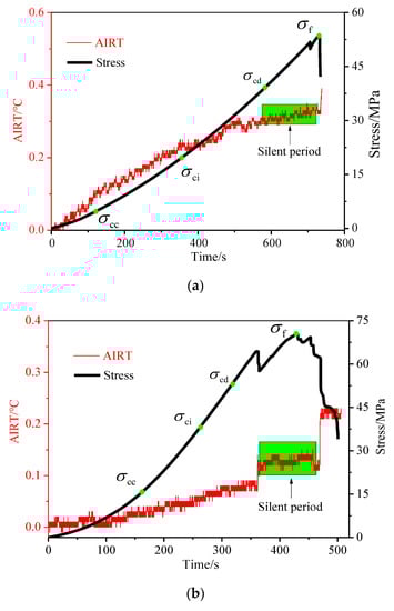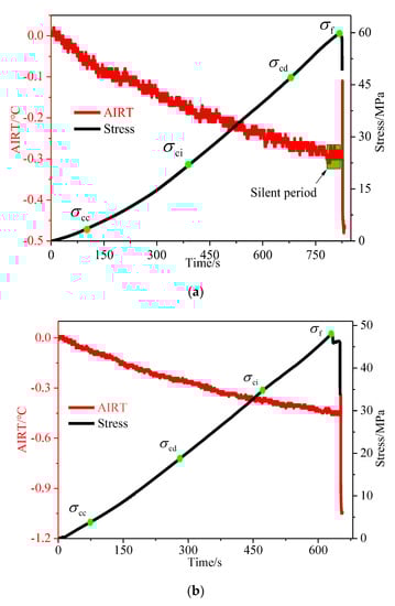 Figure 4 shows the stress–time and AIRT–time curves of the rock samples. During the elastic deformation, the AIRT shows a linear increase with rising stress. The average temperature increase in the rock samples is 0.19 °C (see Table 1). In the stage of stable crack growth, the AIRT of rock continues to rise. Afterwards, during the unstable crack growth, the AIRT increase in rock is the smallest (the average increase in sandstone samples is 0.05 °C). Most samples can even show nearly constant values (with slight fluctuations) in this stage before final failure. These short moments can be called the ‘silent period’ (see Figure 4). During the final failure, fractures are formed throughout the sample, including the surfaces. The micro-cracks on the surfaces will squeeze, move, and slip under compressive stresses. The fracture surfaces in contact move relative to each other, and the friction between the surfaces converts kinetic energy into thermal energy. The thermal energy induced by friction can cause the AIRT of the sample to increase abruptly (see Figure 4b).