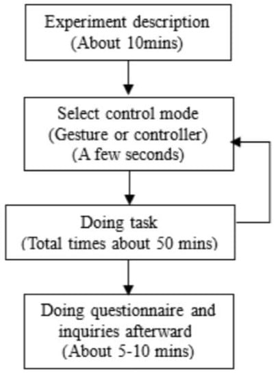 When participants arrived at the laboratory, the research team first introduced the experiment process and explained how to operate XRSPACE MANOVA, after which participants were asked to choose one of the conditions (i.e., hand gesture recognition or joystick control) to begin the assigned tasks. They were then asked to repeat the process in the other condition. Once the participants completed all the tasks, they were asked to fill out the questionnaire and respond to some inquiries. To complete the experiment, each participant spent 1 h to 1 h and 15 min. The entire process is detailed in Figure 5.