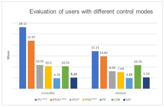 After participants used the hand gesture recognition/joystick control for XRSPACE MANOVA to complete the assigned tasks, a self-reported questionnaire that included qualitative inquiries was used to collect the data. In this study, perceived usefulness (PU), perceived ease-of-use (PEOU), perceived enjoyment (PE), confirmation (CON), and behavioral intention (BIU) scales, borrowed and revised from previous studies, were used to measure the dependent variables by applying a 7-point Likert scale (i.e., strongly agree/strongly disagree). Perception of internal control (POIC) was based on a 7-point Likert scale. Attitude (ATU) and satisfaction (SAT) were used based on a 7-point semantic scale [16,33,43,44]. Table 4 shows the corresponding responses of the participants with respect to different operating interfaces. All constructs measured in this study meet the threshold of the reliability coefficient, as measured by Cronbach’s alpha (see Table 4), which means that all measured items of individual constructs are consistent with. For brevity, the questions listed in the table are the summarized versions of the actual questions that are asked. While collecting the quantitative data, including the participants’ demographic and other information (i.e., gender, college major, time to complete the tasks), qualitative inquiries regarding the participants’ experience with XRSPACE MANOVA were also asked.
