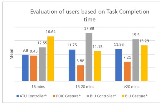 Regarding the difference in task completion time, a one-way ANOVA was used to examine its effect on BIU for the interactive interface in the conditions of hand gesture recognition, which had a statistically significant finding (F(1, 32) = 3.496, p < 0.05). Further analysis of the data shows that users using hand gesture recognition within 15 min and users using hand gesture recognition between 15 and 20 min have substantially different levels of BIU for the interactive interface. Users who completed gestural tasks in less than 15 min had a higher rating of their BIU for hand gesture recognition (M = 16.64, SD = 3.749), whereas users who accomplished the tasks in between 15 and 20 min exhibited a lower perception of it. On the other hand, for the conditions of joystick control, the statistics show that users have a better BIU for the interactive interface when they complete the tasks between 15 and 20 min and a lower level of BIU for joystick control if they use it within 15 min (see Figure 7). No effect was found for gender or college major.
