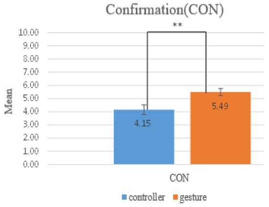 In terms of SAT and CON, although the quantitative results were not statistically significant and the hypotheses were not verified, an effect from different interactive interfaces on the specific measured item about the operating experience was found. The result of the Wilcoxon-signed rank test indicates that hand gesture recognition and joystick control influence the operating experience in confirmation, with a rank mean of Z = −2.869 and a level of significance of p < 0.05. Users have a higher confirmed operating experience when using hand gesture recognition (M = 5.49, SD = 1.523), as shown in Figure 8.