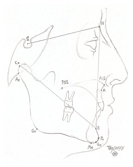 Lateral cephalometric radiographs were obtained and included the following points for the evaluation of skeletal and dental stability: sella (S), nasion (N), B-point (B), condylion (Co), incisor superior (Is), and incisor inferior (Ii).