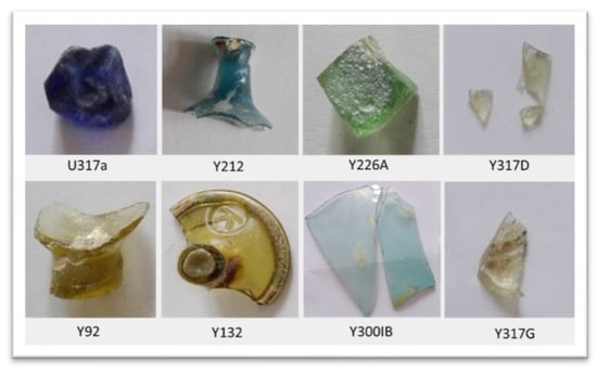- Freestone, I.C. Chemical analysis of ‘raw’glass fragments. Excav. Carthage 1994, 2, 290. [Google Scholar]