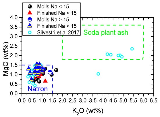 MgO vs. K2O contents of Vasileos Irakleiou Street, 45 glasses compared with Silvestri et al., 2017 [23].