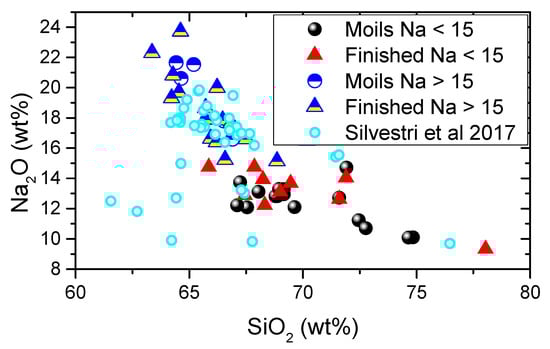 The chemical composition of the finished products shows SiO2 contents ranging from 63.4 to 78.1 wt% with a mean value of 67 ± 3 wt%, Na2O from 9.3 to 23.7 wt% with a mean value of 16 ± 3 wt%, and K2O and MgO from 0.3 to 1.2 wt% with a mean value of 0.8 ± 0.2 wt%, and from 0.6 to 1.5 with a mean value of 1.1 ± 0.2 wt%, respectively.