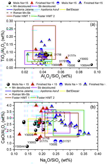 During the first millennium AD, there were major primary glass production centers in the Levant and Egypt, which produced different types of glasses. Among them we mention the Levantine I glass type, which was produced at Apollonia, Israel, 4–7th centuries, and the HIMT glass type, produced from the 4th century in Egypt [12,14]. In order to understand in which production center Vasileos Irakleiou Street, 45 glasses were produced, we used the ratios Al2O3/SiO2 versus TiO2/Al2O3 and Na2O/SiO2 versus CaO/Al2O3 (Figure 4) [9,10,41,42].