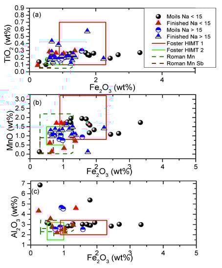Fe2O3 versus TiO2 (a), Fe2O3 versus MnO (b) and Fe2O3 versus Al2O3 (c) of Vasileos Irakleiou Street, 45 glasses compared with bibliographic data [10,25].