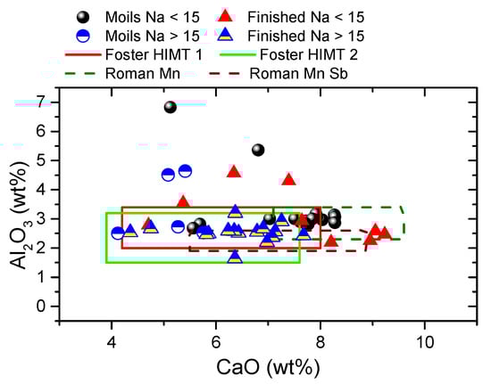 Furthermore, in Figure 6 we plotted the CaO and Al2O3 concentration values of Vasileos Irakleiou Street, 45 glasses, in order to highlight the different lime/feldspar contents of the sand used for the production of the Vasileos Irakleiou Street, 45 glasses. The Vasileos Irakleiou Street, 45 glass finds can be compared with the known late/post Roman glasses such as the Roman Mn, the Roman Mn-Sb [10] and the “HIMT 1 and 2” group [25], and were, probably, produced in Egypt [8,9]. These kinds of glasses are also found in the rest of the areas covered by the Roman Empire, as far as the Netherlands or the United Kingdom [8,25]. The Vasileos Irakleiou Street, 45 glasses (Figure 6) appear to be mainly centered on the ‘HIMT 1 and 2’ area, confirming their age. Some glasses (mainly moils) are outside of the ‘HIMT’ area, confirming the use of recycled glass in glassmaking [12,14].