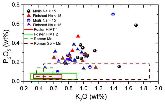 Therefore, if we consider recycling in terms of the variations of Na2O, K2O and especially of Mn and Sb elements which are unintentionally incorporated into the batch glass during re-melting episodes [43,49], then these components can provide an indication that recycling has occurred. However, their concentrations depend on the amount of decolored glass added to the batch glass, and to the context, e.g., longer melting durations and higher temperature. The elements that reflect the amount of time at high temperature are the K2O and P2O5 concentrations. In the Vasileos Irakleiou Street, 45 glasses a simultaneous enrichment in both K2O and P2O5 concentrations is observed (Figure 7), which is possibly due to the contamination of the glass by fuel ash vapor [10,50,51].