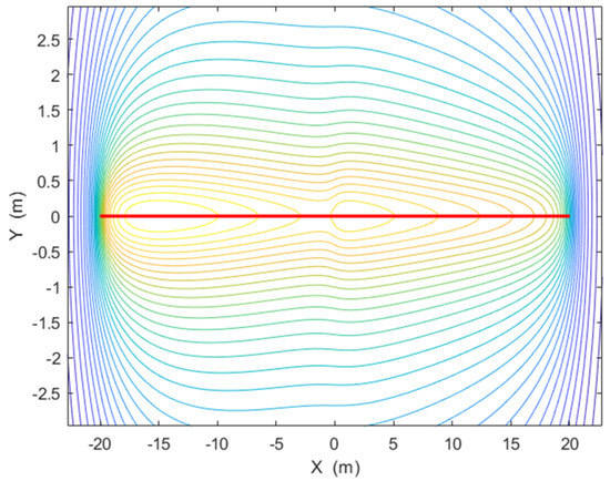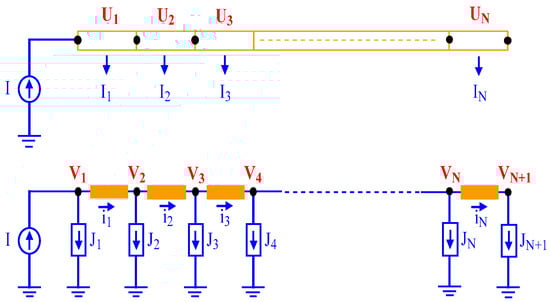 9]. The incoming current through the injection point is distributed throughout the conductor and is filtered to ground through its surface so that the electrode becomes equipotential. The injection point is not important, and only the magnitude of the fault current is the initial relevant information. The leakage current to the ground in each part of the electrode is calculated without difficulty. With this information, the grounding resistance and potentials at the ground surface, with which step and touch potentials are evaluated, are calculated. Such potentials are important magnitudes since they characterize the electrical behavior of the electrode [