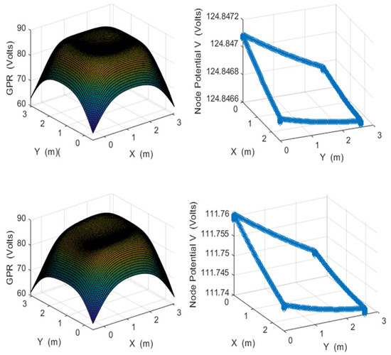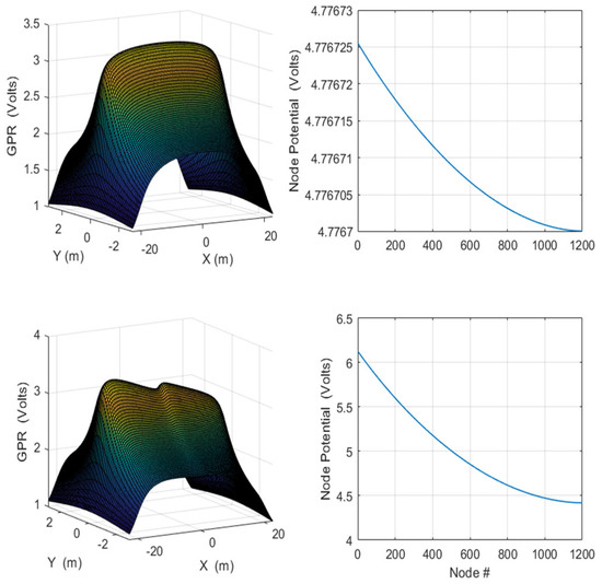 Figure 6, the GPR of the PEC grid is shown. In the right panel, the node potentials of the ideal electrode are shown. The electrode is equipotential. In the lower panels, the same magnitudes are represented but considering the internal resistance
