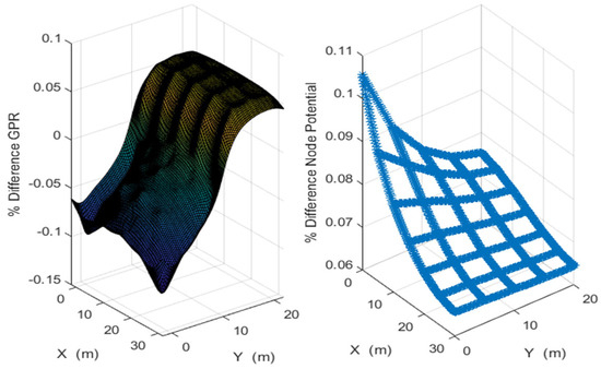 Figure 7 shows, on the left panel, the GPR percentage difference between the two situations, while on the right, the node potentials’ percentage difference is shown. As seen in
