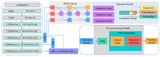 To obtain better long-term correlation, Wang first proposed a synchronous detection and tracking method based on appearance features called JDE [7]. It uses a unified network to combine output detections with their corresponding appearance embedding. JDE extends YOLOv3 [9] with a re-identification branch that is trained using the triplet loss and jointly learned with the detection loss. For each new frame, JDE uses the combination of all embedding of detections belonging to the trajectory wave to update the appearance embedding of the trajectory wave. The similarity score is a combination of the cosine distance between the appearance embedding and the Mahalanobis distance between the current detection and the predicted bounding box of the trajectory wave computed using the Kalman filter. Then, the Hungarian algorithm is used to find the optimal allocation. JDE speeds up the reasoning time. However, it is only evaluated on the pedestrian tracking dataset. Meanwhile, the detection module and Kalman filter can be further improved.