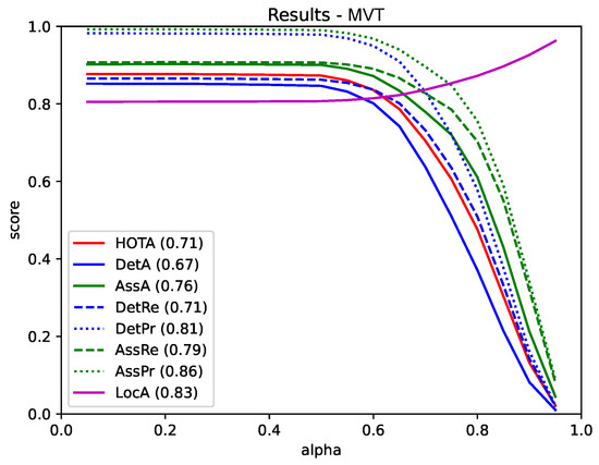 Due to the complexity of multi-object tracking, there are a large number of metrics to evaluate its performance. From all video sequences, we compute more than 20 metrics by using evaluation tool that official organization provides, such as the HOTA tracking metrics (HOTA, DetA, AssA, DetRe, DetPr, AssRe, AssPr, LocA) [17], the CLEARMOT metrics (MOTA, MOTP, MT, ML, Frag, etc.) [18], identity metrics (IDs, IDSW, etc.), and fragmentation (Frag) [19] metrics. HOTA is able to comprehensively evaluate the performance of detection and data association in the TBD paradigm. While Frag focuses more on association performance, MOTA evaluates detector capabilities and focuses more on detection performance.