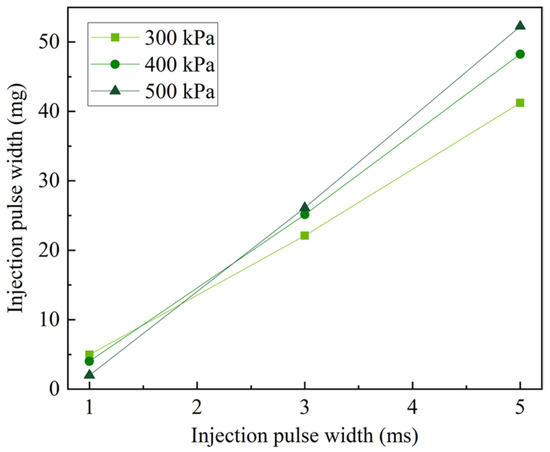 The schematic diagram of the experimental setup was given in Figure 1, which consisted of a fuel injection system, a temperature measurement and control system, and an image acquisition system. In this study, a 14-hole low-pressure methanol injector with hole diameters of 0.26 mm was used, of which flow characteristics were given in Figure 2. The injection pulse width and injection time were set in the control software. The injection pressure was controlled by a methanol pump and measured by a pressure gauge (0–1000 kPa, ±1 kPa). A piece of frosted quartz glass with an average roughness of 10.31 μm was placed under the injector as the impact wall. The temperature control system was used to realize different wall temperature conditions, including a box resistance heating furnace, which was used to heat quartz glass, and a temperature sensor (−50–1000 °C, ±0.1 °C) to monitor the glass surface temperature. After the glass was heated to the preset temperature, it was placed on the central tray as soon as possible, and methanol spraying was started. The measurement showed that the temperature difference before and after this process was no more than 2 °C. In the experiment, the DC LED lamp was used as the light source, of which uniformity was further improved by using the acrylic matte diffuser. The side view of the spray was photographed by a diffuse back-illumination (DBI) method [26], and the process of the wall wetting was captured by the camera (Phantom Miro EX4@4000fps) through a 45° mirror.
