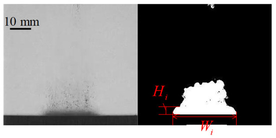 In this study, the spray penetration and area were extracted from spray images by using MATLAB codes developed by our group. First, an original image was converted to a grayscale image. After background subtraction, and Wiener filtering [27], the image was binarized using the threshold obtained by the Otsu algorithm [28], and finally, the image parameters were calculated. For all measurement parameters, the averaged results with a statistical error bar calculated from five repeated events were depicted. Figure 3 showed a diagram of typical impinging spray and defined impinging spray height and width .