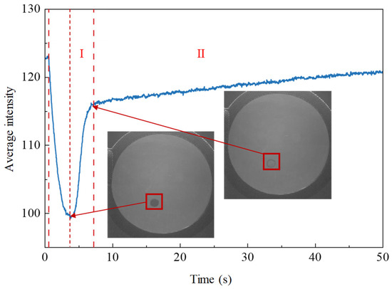 At 293 K and 94.7 kPa, the mixed solution of methanol and n-octanol was used to calibrate the RIM method. Figure 4 showed the curve of the average light intensity with time after 0.5 μL solution (99%vol methanol and 1%vol n-octanol) was deposited on the surface of the glass. As illustrated, the process from the beginning of the curve to the lowest intensity was dominated by the solution spread. The rise of the curve indicated that the evaporation was in dominant control [25]. Methanol evaporates faster than n-octanol, resulting in the rising process of the curve undergoing two stages; in stage I, the average light intensity of ROI was increasing rapidly with the evaporation of methanol. At 7.2 s, the growth rate of ROI average light intensity curve slowed down significantly. It could be considered that the methanol completely evaporated at this time, and the subsequent increase of ROI average light intensity was caused by the evaporation process of n-octanol (in stage II). The intersection between the two segments was the calibration point.