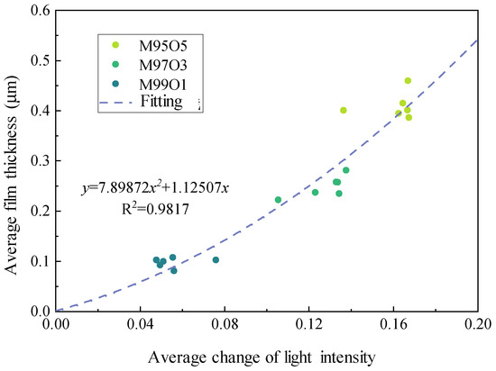 As shown in Figure 5, the relationship curve between the adhesive fuel film thickness and the change of light intensity was obtained. Then, the fitting formula was given in Equation (3), and the R2 was 0.9817.