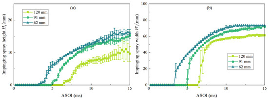 The trend of was similar to that of (Figure 14c). At 10 ms ASOI, at the height of 120 mm was significantly lower than that at 91 mm and 62 mm . The reverse override was completed at 26 ms ASOI. After that, showed a positive correlation with . The more kinetic energy loss of the droplets was caused by the higher the spray distance. Therefore, more droplets tended to adhere after impacting the wall, rather than “splash”. At 100 ms ASOI, for the 62 mm Dimp data was only 75.9% and 79.7% of that at the distance of 120 mm and 91 mm, respectively.