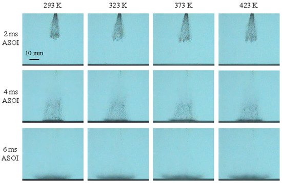 Figure 8 showed the impinging spray morphology under different wall temperature (from 293 K to 423 K). The three sprays had a similar macro shape with various wall temperature conditions.