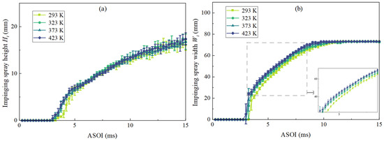 Figure 9 showed the changes in Hi and Wi with time. When was 323 K, 373 K, and 423 K, Hi was significantly higher than that of the usual temperature wall before 5 ms ASOI. However, in the following time, the changes of Hi corresponding to different were similar. Generally, Hi of methanol spray on the wall was positively correlated with . Similarly, Wi was positively correlated with . However, the relative difference between Wi curves of 373 K and 423 K in a short time after the spray impacted the wall is small. After about 6.5 ms ASOI, the growth rate of Wi was gradually lower when was 373 K than when was 423 K. The reason for the above results was that, on the one hand, the density decreased due to the rise of air temperature near the wall, and the resistance to droplet movement decreased to a certain extent; on the other hand, it was the strengthening of spray secondary atomization caused by the hot wall. This was similar to the previous research results of Li et al. [14].