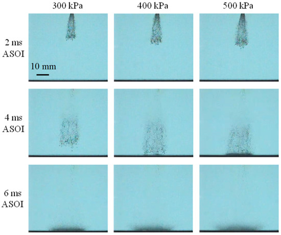 The spray morphology under different (300 kPa to 500 kPa).