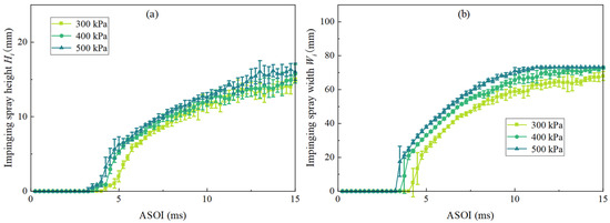 Figure 11 showed the changes of Hi and Wi with time under different . Under a higher injection spray pressure, the impact energy of the droplet was higher, and the splashing behavior was more likely to occur after the impact of the wall. Therefore, both Hi and Wi were positively correlated with . At 15 ms ASOI, the average Hi with the injection pressure of 300 kPa, 400 kPa, and 500 kPa was about 15.0 mm, 15.7 mm, and 16.0 mm, respectively. For Wi, there were obvious differences in the change curves under the three injection pressures. When 300 kPa was applied, the time required for Wi to reach the limit of vision was at least 33% longer than that when of 500 kPa was applied.