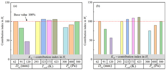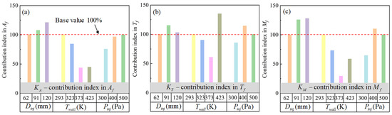 Figure 19 illustrated the contribution indices of different boundary conditions in (Figure 19a), (Figure 19b) and (Figure 19c), respectively, where , and under 62 mm , 293 K , 500 kPa were set as the base values, that is, , , and of the values were 100%.