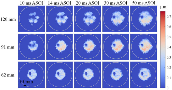 The results of were relatively complex, as shown in Figure 14b. Compared with the case of 62 mm , the spray impingement phenomenon occurs after a longer period of time after the start of spraying while was 120 mm and 91 mm. At 10 ms ASOI, the corresponding at these two distances was still rising due to the large settlement of droplets. At the same time, in the early stage of the end of the spray impingement, the adhesive fuel filled the deeper “gullies” on the frosted surface during the movement, resulting in the increase of [31]. However, on the whole, when the injector was at the height of 91 mm, it corresponded to the thickest in the three , and the distance condition of 62 mm corresponded to the thinnest in the three .
