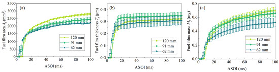 Figure 14 showed the quantitative results of fuel film area , average fuel film thickness , and fuel film mass with different . When was 120 mm, the spray impingement process has not been completely completed at 10 ms ASOI, so was slightly lower than the corresponding at of 91 mm and 62 mm (Figure 14a). With the subsequent droplet wall collision and sedimentation process going on, at of 120 mm overtook that at of 91 mm and 62 mm at 16 ms ASOI. After that, maintained a positive correlation with . At 100 ms ASOI, at 62 mm was 79.6% and 90.7% of that at 120 mm and 91 mm , respectively.