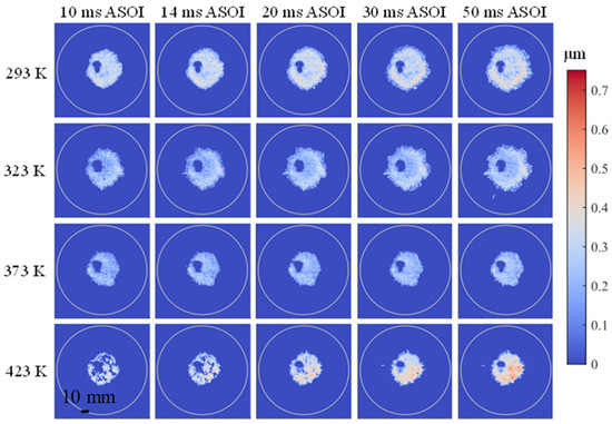 Pseudo color images of fuel film on the wall with temperature 293 K under different . As described before, results only from 10 ms ASOI were available for analysis.
