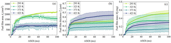 Figure 15 showed pseudo-color images of adhesive fuel under the different wall temperature of . When the wall temperature was 423 K, the adhesive fuel boiled, which had a great impact on the intensity, and then interfered with image recognition. After 20 ms ASOI, the overexposure caused by fuel adhesion boiling was no longer significant, so the data of 20 ms ASOI to 100 ms ASOI were discussed. The fuel film area basically showed a negative correlation with the wall temperature (Figure 16a), but the trend of corresponding to 373 K and 423 K was almost the same, which was caused by that part of the adhesive fuel extending outward at the edge and droplets settling at the periphery of the liquid film area where it evaporated quickly with higher .
