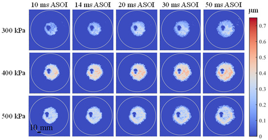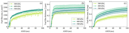 Figure 17 showed the pseudo color images of fuel adhesion formation under different injection pressure . Figure 18 gave the time-dependent curves of , and obtained from image analysis. Similar to results of pseudo color images, the two working conditions of 400 kPa and 500 kPa showed similar change of within the studied time range (Figure 18a), however, when was 300 kPa, was significantly lower than that of the other conditions. Compared with of 300 kPa, (Figure 18b) and (Figure 18c) at of 400 kPa increased. When was further increased to 500 kPa, and were lower than those at 400 kPa, as a result of which the droplet velocity increased and the kinetic energy when hitting the wall was greater; more droplets tended to splash rather than adhere. At 100 ms ASOI, under 300 kPa, 400 kPa and 500 kPa , the percentage of adhesive fuel mass in the total injection volume was 1.5%, 2.2% and 1.9%, respectively.