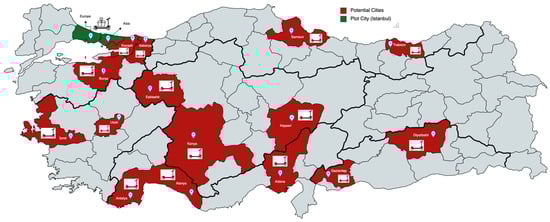 This work evaluates the use of e-scooters in package and mail distribution in terms of cost and time. The data of the study was obtained by the PTT (Turkish Post Office), an official organization of Turkey. Data from 15 different cities (a total of 17 districts) in Turkey were used. These cities with the e-scooter application are shown in Figure 1. The data used in this study are the data of e-scooter test drives in different cities in Turkey. The data of the variables in the study’s data set belong to the plot regions’ environmental and geographical characteristics, as well as the demographic data of the drivers driving e-scooter vehicles. In addition, as a result of the trial runs, output variable data of time and energy parameters were obtained. E-scooter vehicles are used for package or postal deliveries in the megacity of Istanbul as an application of plot zone [45]. It is planned to expand the e-scooter application for mail or package delivery in other potential cities. The cities where the study data are obtained have been considered potential regions by the PTT’s widespread use of e-scooters for mail or mail delivery. The number of trips made by e-scooter vehicles in these regions is defined as the number of packages or mail deliveries. Data from different regions were used to compare the results obtained to verify the validity of the methods developed for this study.