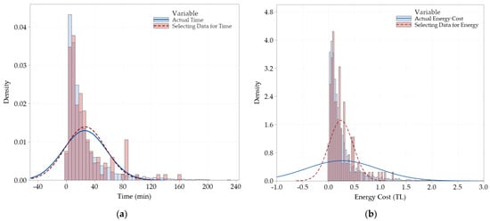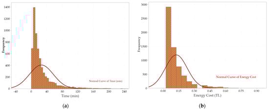 This study aimed to evaluate the use of e-scooters for parcel or mail delivery in terms of time and energy costs, considering the input parameters. Mail delivery time and the energy cost required for delivery are considered output or independent variables in this study. The datasets of the output parameters used for this study are provided in Figure 2a,b. In this study, a total of 15 input parameters under four different headings were determined and used to calculate the estimation data on the output variables (this study dataset consists of 6269 records and 17 variables, including inputs and outputs). Different input parameters were preferred under headings, such as demographic values of e-scooter drivers, environmental factors, time characteristics (daily, monthly, and seasonal variables), geographical features, and operation type.