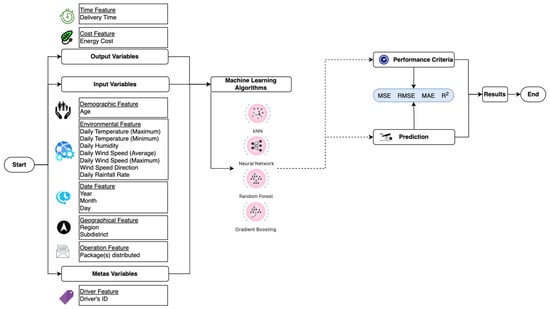 The machine learning (ML) algorithms are used to show the advantages of e-scooter vehicles preferred by PTT in postal and package transportation in terms of time and cost and to estimate the delivery time and energy cost of a package in the present study. ML algorithms were preferred for showing the advantages of e-scooter vehicles selected by PTT in mail and parcel transportation in terms of time and cost and to estimate the delivery time and energy cost of a package depending on different input parameters. In the models of ML algorithms, 15 input parameters with demographic, environmental, geographical, time, and operational characteristics were used. A quantity of 6269 data were used for the data volume of the preferred input and output parameters for ML algorithms. The method flowchart and parameter properties of the methodology of the study are visualized in Figure 3. In the continuation of this section, detailed information about the features of the ML method and algorithms developed for the study is provided.