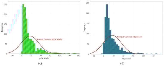 In this study, ML algorithms have been developed to estimate the energy cost of package or mail distribution with e-scooter vehicles. One thousand two hundred fifty-three test data were assessed with RF, GB, kNN, and NN algorithms and compared with accurate data. Actual and forecast data for energy costs are shown in Figure 7a–d.