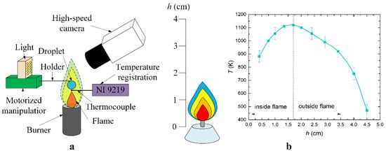 The high-temperature flame zone was created with the help of a burner based on ethanol (maximum temperature: 1150 K) (Figure 1). The temperature in the flame of the alcohol burner was recorded using a system featuring a National Instruments data collection module and fast thermocouples with a measurement accuracy of at least ±3 K and a response time of less than 0.1 s. To calibrate the system, the flame temperature was measured in several sections at different distances with an increment of 0.5 cm from the burner. The temperature measurement scheme and data are given in Figure 1b.