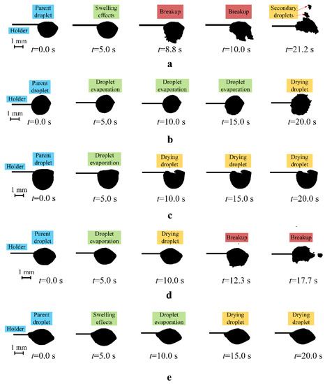Images showing the evaporation, drying, and breakup of C50W49D1 (a), C50W49LE1 (b), C50W49LI1 (c), C50W49R1 (d), and C50W50 (e) at Ta ≈ 450 K and Rd0 ≈ 1.0 mm.