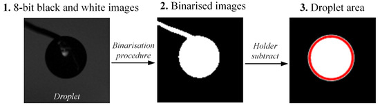 From the typical video images shown in Figure 2, specially developed MatLab software was used to analyze droplet sizes and shapes before breakup. Video frames showing the evolution of the sizes and shapes of droplets before breakup were transferred into avi format. These were used as input for the software. The video frames were then transferred into a sequence of 8-bit black and white images. In the following step, the binarized of images was performed. The binarization threshold was selected individually for each series of experiments. The area occupied by the holder was subtracted from the binarized images. In the next step, a special function, based on the algorithm of morphological reconstruction, was applied to “fill the gaps” in the images produced during the binarization process. The main steps for postprocessing the sizes and shapes of droplets are shown in Figure 3.